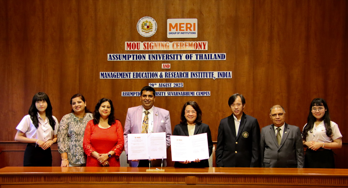 Assumption University of Thailand (AU) and MERI-Group of Institutions, India, have marked a significant step in global academic collaboration by signing a Memorandum of Understanding (MoU) on August 29, 2023. The signing took place at AU's Suvarnabhumi Campus, with Asst. Prof. Dr. Uree Cheasakul, AU's Deputy Vice President for Academic Affairs, and Prof. Lalit Aggarwal, Vice President of MERI-Group, formalizing the partnership.